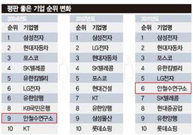 안철수연구소가 우리나라 기업 중 가장 명성 높은 기업 6위에 올랐다. 이는 이코노미스트와 PR컨설팅 업체 코콤포터노벨리가 공동조사한 ‘한국기업명성지수(KCRI)’ 조사 결과로 2004년 9위에 이어 2011년에는 6위로 3계단 올라간 것이다.
