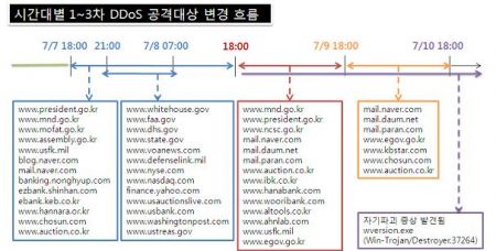 국내외 특정 정부기관을 대상으로 한 분산서비스거부(이하 DDoS, Distributed Denial of Service) 정황이 포착되었다. 총 3차(7/7 18:00 ~ 7/10 18:00)에 걸친 DDoS 공격이 감행되었고, 공격에 활용되었던 DDoS 좀비 PC(감염 PC)들은 “소프트웨어적 하드디스크 손상”이라는 자기파괴증상을 끝으로 생을 마감하도록 설계되었다.