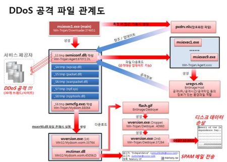 이번 공격에 이용된 악성코드는 공격 대상 웹사이트 목록을 담은 파일(BinImage/Host), 네트워크 트래픽을 유발하는 다수의 에이전트(Agent.67072.DL, Agent.65536.VE) 등이 있다. 이들 악성코드가 설치된 PC는 이른바 ‘좀비 PC’가 되어 일제히 특정 웹사이트를 공격하였다.