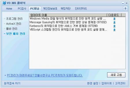 V3 365 Clinic의 경우에도 V3 Lite와 거의 동일하다. ‘PC튜닝’ 탭을 통해 ‘PC 관리’ 메뉴에 들어가면 마찬가지로 Windows 보안 업데이트를 손쉽게 적용할 수 있다.