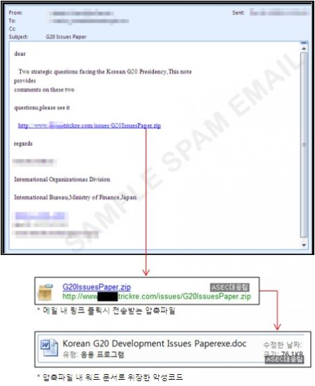 ‘G20 Issues paper’ 라는 제목으로 마치 G20 관련 문서가 포함된 메일인 것처럼 위장하고, 수신자가 메일에 포함된 링크를 클릭하면 MS워드문서로 위장한 악성코드가 담긴 압축파일이 다운로드 받게 됩니다.