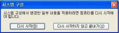 그런데 선택 or 해제 후 [적용]→[닫기] 순으로 선택하면 재부팅 관련 경고창이 나타납니다. 이때 작업하던 모든 작업은 저장하고 [다시 시작]을 선택하여 재부팅을 합니다.