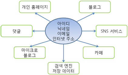 [그림 1]과 같이 소셜 네트워크 서비스를 이용할 때, 그 당시에는 의미 없고 단편적인 일일지 모르지만 그런 정보들이 모이고 모이면 중요한 개인정보나 사생활 정보가 될 수 있으며, 또 이렇게 수집된 정보가 악용될 소지 또한 높습니다.