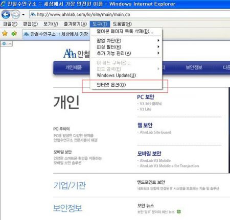 [그림1] 인터넷 창 상단에 있는 “도구”의 “인터넷 옵션”을 클릭한다.