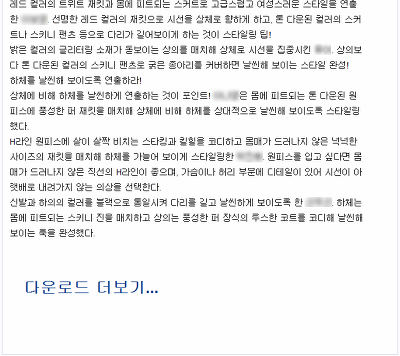 특히 유달리 튼튼한 하체때문에 평소에도 고민이 많았던 H양은 하체를 좀 더 날씬해보이게 하는 코디법에 관해 집중해서 읽고 있었습니다. 그러던 중, "응?" 뜬금없이 <다운로드 더보기>라는 메시지가 나타납니다.