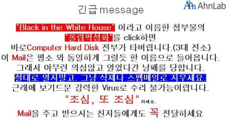 "Black in the White House"라고 명칭이 붙은 첨부물 "올림픽 성화"를 Click하는 순간부터 여러분들의 Computer Hard Disk의 데이터 전부가 타버린답니다...."