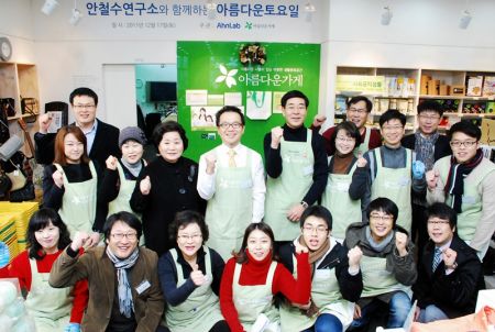안랩 김홍선 대표는 " 안랩은 사회의 한 구성원으로서 함께 살아가는 사회에 기여한다는 창업 이념을 유지하고자 아낌없는 노력을 하고 있다. ‘아름다운 토요일’과 같은 지속적인 사회공헌활동을 통해 우리 사회에 나눔과 기부 문화를 확산시키는 데 일조하길 바란다”고 말했다. <Ahn>