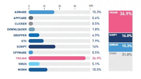 2011년 7월의 감염보고건수 중 악성코드를 유형별로 살펴보면, 트로이목마(TROJAN)류가 36.9%로 가장 많은 비율을 차지하였으며, 스크립트(SCRIPT)가 16%, 애드웨어(ADWARE)가 15.3%로 각각 그 뒤를 잇고 있습니다. [그림 1]은 지난 7월 한달 동안 안철수연구소가 집계한 악성코드의 유형별 감염 비율을 분석한 결과입니다.