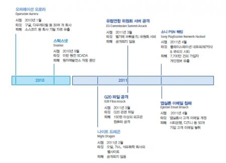 대표적인 APT 공격 사례는 [그림 2]와 같으며, 국내에도 2011년 한 해 동안 크고 작은 공격이 수 차례 이루어지고 있습니다.