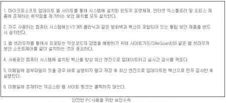 이런 사회공학적 보안 위협들은 향후에도 지속적으로 나타날 것으로 보입니다. 트위터, 페이스북과 같은 SNS를 이용할 때 확인할 수 없는 단축 URL의 클릭을 주의해야 합니다. 아울러 윈도우 운영체제(OS) 및 인터넷 익스플로러, 오피스 제품의 보안 패치를 설치하고 보안 소프트웨어 업데이트를 정기적으로 실시해야 합니다.