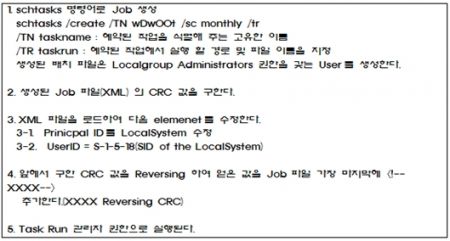 LocalSystem의 권한으로 등록된 실행 파일이 실행됩니다. 변경된 Job 환경 파일에 아래와 같은 이상한 문자열이 등록되는데, 이것은 reversing한 CRC 값이 추가된 것입니다. <Ahn>