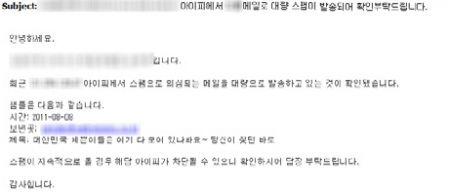 안녕하세요. 안랩인입니다. 2011년 8월, 웹 서비스를 제공하고 있는 한 업체가 자사의 서버에서 스팸 메일을 대량 발송하는 사건이 일어났다며, 안철수연구소 A-FIRST(AhnLab Forensic & Incident Response Service Team)에 분석을 의뢰했습니다. 이 업체는 자사의 서버가 스팸 메일을 발송하고 있다는 사실도 스스로 인지한 것이 아니라, 스팸 메일을 수신한 포털 사이트 메일 사용자들이 항의해서 알게 됐습니다. [그림 1]은 해당 업체가 받은 경고 메일입니다.