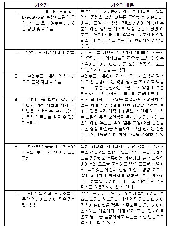 이 밖에 변종 악성코드에 대응해 오진 가능성의 문제점을 해결한 기술(보충자료4), 동일한 유형의 실행 파일과 악성코드를 효율적으로 진단하고 분류하는 기술(보충자료5), PC가 악성코드에 감염돼 백신 업데이트 서버 접속이 차단된 경우에 대응하는 기술이 있다(보충자료6).