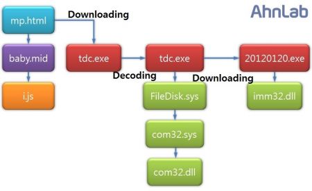 해당 MS12-004 취약점을 악용하여 유포된 악성코드와 관련된 사항들을 ASEC에서 추가적인 조사를 진행하는 과정에서 해당 악성코드는 아래와 같은 전체적이 구조를 가지고 있는 것으로 파악하였습니다.