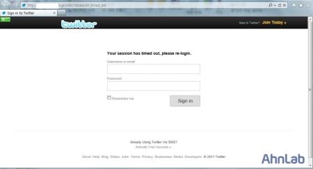 안녕하세요. 안랩인입니다. 2012년 1월 26일 해외를 중심으로 트위터의 메시지를 통해 트위터 사용자 계정과 암호를 수집하려는 피싱(Phishing) 시도가 발견되었습니다. 단축 URL을 이용하여 사용자가 호기심을 가질만한 내용으로 위장하는 등 기존의 피싱 수법과 동일하였습니다. 과거에도 트위터를 이용한 피싱 시도가 있었는데, 2010년 2월 24일 트위터의 다이렉트 메시지의 단축 URL을 이용해 피싱 웹사이트로 접속을 유도한 사례 등이 그것입니다