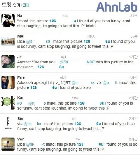 따라서 트위터 상에서 잘 모르는 사람을 통해 전달 받은 메시지에 포함된 단축 URL을 클릭할 때에는 주의를 기울여야 합니다. <Ahn>