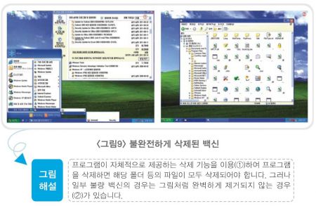 이런 '진드기형' 백신은 어떻게 하든 이용자가 프로그램을 사용하도록 유도하는데 그 목적이 있습니다. 이러한 불량 백신은 PC에서 프로그램을 삭제하는 기본적인 방법인 '시작->설정->제어판->프로그램 추가/제거'를 통해서도 삭제할 수 없도록 프로그램을 구성해 놓는가 하면, <그림 9>처럼 삭제를 하더라도 완벽한게 삭제되지 않는 경우도 있습니다.