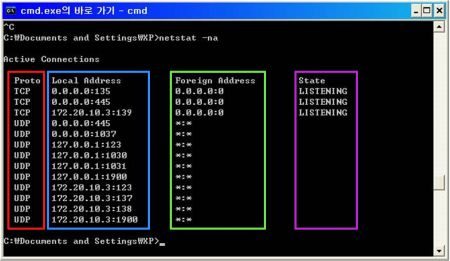 [그림 2]는 PC 부팅 후 바로 netstat –na 명령어를 실행한 화면으로, 아직 인터넷에 접속하지 않았기 때문에 Windows OS에서 사용하는 기본 포트정보만 보이고 있습니다. <Ahn>