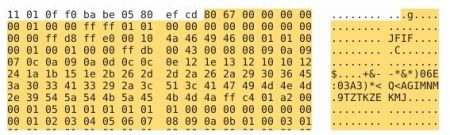 패킷 데이터가 워낙 많다 보니 일일이 다 확인하기는 어렵지만, 전반적으로 살펴봤을 때 Payload는 랜덤 스타일의 데이터로 채워져 있었으며 의심할 만한 문자열은 발견되지 않았다. 전달받은 패킷 파일만 하더라도 수백 Mbps이므로 분석가가 이것을 다 살피는 데는 한계가 있습니다. 게다가 기본적으로 알 수 없는 문자열들의 조합으로만 이루어져 있어서 분석이 쉽지 않았습니다. 그런데, 필자의 눈을 사로잡은 것이 있었으니 그것은 JFIF라는 문자열이었습니다.