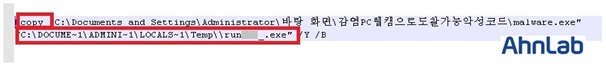 run***_.bat 파일은 최초 실행된 악성코드를 C:\Documents and Settings\Administrator\Local Settings\Temp\ 경로로 복사하는 기능을 수행합니다. 파일에 저장된 내용은 그림 2와 같습니다.