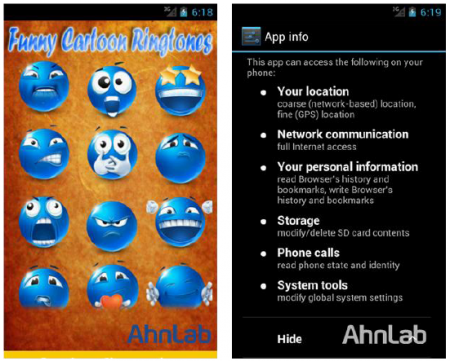 안녕하세요. 안랩인입니다. PC를 사용하다 보면 원치 않는 툴바와 쇼핑몰 아이콘이 설치되고, 자꾸만 광고창이 뜨는 것을 경험해 봤을 것 입니다. 이렇게 사용자의 불편을 초래하는 프로그램을 애드웨어 또는 스파이웨어라 부릅니다. 그런데 최근 스마트폰을 타깃으로 하는 애드웨어 앱이 발견되어 문제가 되고 있습니다. 특히, 사용자들의 위치 정보, 기기 정보 등의 개인정보가 유출될 수 있어 그 문제의 심각성이 큽니다.