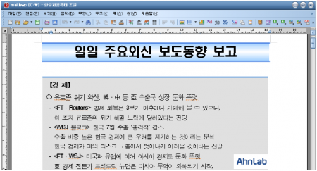 안녕하세요. 안랩인입니다.최근 아래아한글 취약점을 공격하여 OS의 파일 실행 권한을 획득한 후 키로거 등의 정보 유출형 악성코드를 추가 감염시키는 형태의 악성코드가 많이 발견되고 있습니다. 이 악성코드는 특정 언론사의 기사 또는 해외 뉴스 스크랩으로 위장했습니다.