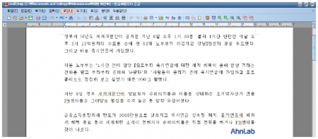 안녕하세요. 안랩인입니다.최근 아래아한글 취약점을 공격하여 OS의 파일 실행 권한을 획득한 후 키로거 등의 정보 유출형 악성코드를 추가 감염시키는 형태의 악성코드가 많이 발견되고 있습니다. 이 악성코드는 특정 언론사의 기사 또는 해외 뉴스 스크랩으로 위장했습니다.
