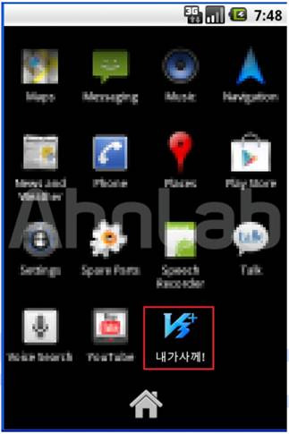 사용자가 메시지의 URL을 실행하면 ‘V3 모바일 플러스’와 유사한 아이콘의 악성 앱이 설치된다(보충자료 2 참조). 해당 악성 앱의 아이콘의 모양은 V3와 유사하지만 이름은 ‘내가사께!’로 나타난다. 이는 예전에 ‘내가사께!’라는 악성 앱을 만든 동일한 제작자가 V3를 사칭한 악성 앱을 제작하면서 미처 이름을 변경하지 못한 것으로 예상된다.