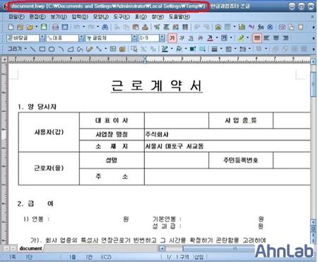 지난 10월 25일 일반 기업들의 연봉 계약서 내용으로 위장하여 유포된 취약한 한글 파일이 발견되었다. 이 파일은 '연봉계약서.hwp'라는 파일명을 가졌으며 내용은 아래와 같다.