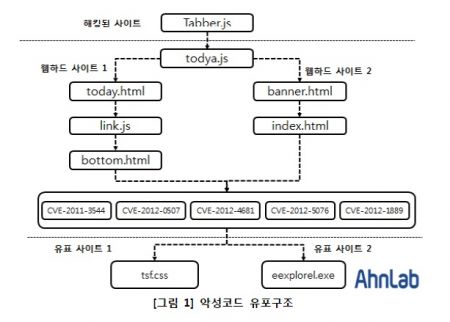 문제는 해당 악성코드가 유포된 방식이다. 해킹 및 악성코드 제작자는 두 가지 이상의 목적을 실행하기 위해 여러 곳에 이른바 악성코드 ‘지뢰’를 숨겨두고 사용자가 그 ‘지뢰밭’을 그냥 지나치지 못하도록 했다. 단계별로 악성코드에 근접해가도록 형성해놓은 그 복잡한 구도는 보는 이로 하여금 혀를 내두르게 할 정도다.