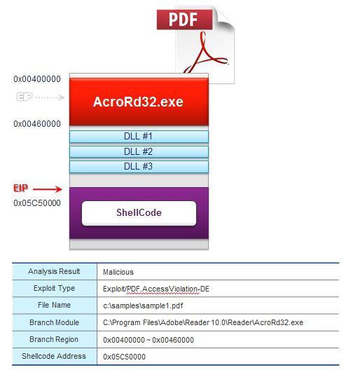 [그림 4]는 DICA 기술을 통해 문서 파일에 삽입된 셸코드를 탐지한 사례다. 해당 파일은 브랜치 모듈의 메모리 영역에 익스플로이트가 발생해 EIP가 정상적인 영역 외에 셸코드 영역을 동작시킨다. DICA 기술은 셸코드가 실행되기 전에 해당 파일의 EIP가 비정상적으로 동작하여 정상 메모리 영역(AcroRd32.exe)이 아닌 셸코드(0x05C50000) 영역으로 이동하는 것을 탐지했다.