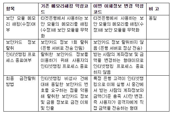 - 이번 이체정보 변경 악성코드: 각 타깃 은행 별 보안 모듈의 메모리를 해킹(수정)해 보안 모듈을 무력화 -> 인터넷뱅킹 로그인 ID/PW, 공인인증서 비밀번호 등 금융정보 탈취, 보안카드 정보는 탈취하지 않음 -> 이체 실행 시, 수신인의 계좌번호를 공격자가 원하는 계좌번호로 변경, 조건 충족 시 이체 금액도 변경 -> 인터넷뱅킹 프로세스 정상 종료