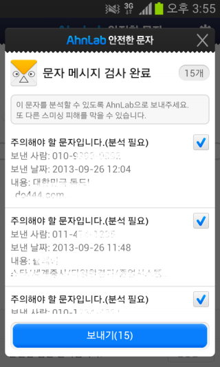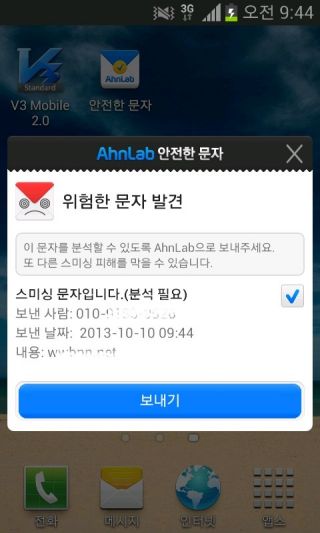 사용자는 ‘안전한 문자’를 이용해 실시간으로 악성 URL이 포함된 문자 메시지나, 악성 앱을 다운로드하는 URL 링크를 감지하고 V3 모바일로 즉각 치료하면 된다.