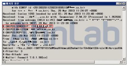 아래 [그림 2]와 같이 메일 원본의 헤더 정보를 살펴보면 발신지 IP(KR)를 확인할 수 있는데, 해당 IP는 TCP 25번 포트가 오픈돼 있었고, 릴레이가 허용돼 있지 않아 외부에서는 메일을 발송할 수 없었다.