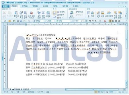 악성코드 감염 시 실행되는 ****모집내용 및 상관대우.hwp 파일은 정상파일으로 [그림 5]와 같이 제목과는 상관없는 신문광고 공개 입찰 내용과 광고 금액이 들어있다.