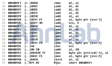 notice.html이 생성한 실행파일의 내부코드를 살펴보면, 암호화된 것으로 보이는 문자열들이 존재한다. 해당 코드들은 [그림 3]과 같이 복호화 루틴을 거쳐서 복호화된다.