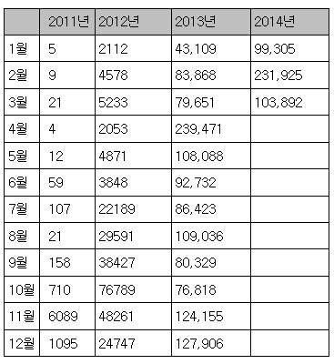 1. 2011~2014년 월별 스마트폰 악성코드 발견 건수
