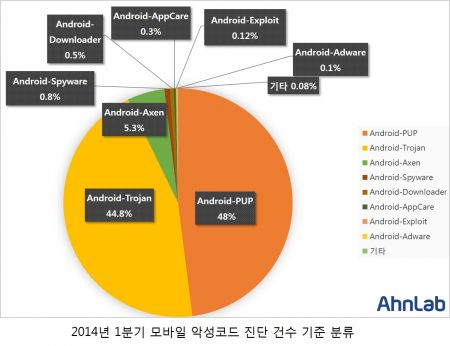 올 1분기 동안 수집된 악성코드를 (진단)건수 기준으로 분류하면, PUP(Potentially Unwanted Program, 유해 가능 프로그램, 보충자료 2 참조)가 20만여 건으로 전체 48%를 차지했다. 이어서 사용자의 스마트폰에 숨어 정보유출, 과금 등 악성 행위를 하는 트로이목마 악성코드의 개수가 19만여 개로 전체의 44.8%를 차지했다. 이 두 가지 악성코드 진단 건수가 전체의 약 93%를 차지하고 있으며, 이어서 사용자 몰래 정보를 수집하는 스파이웨어, 다른 악성코드를 추가로 설치하는 다운로더, 향후 악의적인 목적으로 활용될 수 있는 앱케어 등이 소량씩 발견되며 뒤를 이었다.