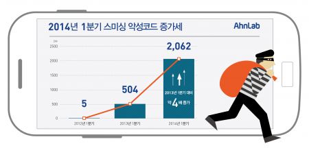 안랩(CEO 권치중, www.ahnlab.com)은 내부 집계 결과(보충자료 2), 2014년 1분기 스미싱 악성코드가 총 2,062개 발견됐다고 밝혔다. 이는 지난 해 1분기 504개 대비 약 4배, 2012년 1분기 5개에 비하면 무려 400배 이상 증가한 수치이다.
