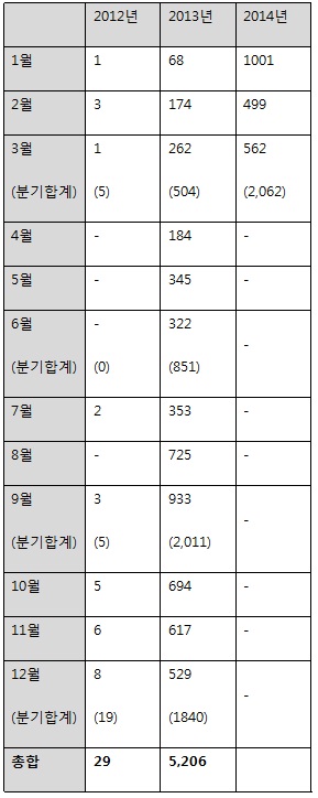 - 1분기 스미싱 악성코드 총 2,062개로, 작년 1분기 대비 약 4배, 2012년 1분기 대비 약 400배 이상 증가