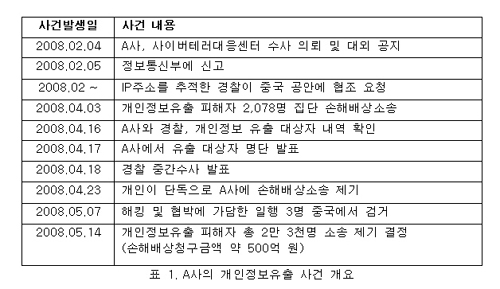 2008년 2월, 국내 최대의 전자상거래 업체인 A사가 해킹을 당해 개인정보가 유출된 사건이 보도되었다. 1,081만 명이라는 엄청난 수의 개인정보가 유출된 사상초유의 사태가 발생한 것이다. 물론 크래킹(해킹을 악용해 피해를 주는 행위 또는 파괴적이거나 불법적인 해킹을 의미함)은 이전에도 행해져 왔다. 그러나 A사가 회원 1,800만 명을 보유한 국내 유명 쇼핑몰이라는 점과 유출된 회원의 정보량이 방대해 그 충격은 매우 컸다. “개인정보보호”에 대한 각계각층의 의견 개진과 뉴스가 연일 올라오고 있다. 다양한 기사들을 토대로, 그간 진행된 A사 사건의 흐름을 간략히 살펴보면 아래 <표 1>과 같다.