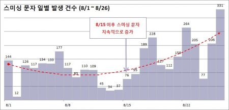 안랩이 지난 8월 1일부터 26일까지 발견한 스미싱 문자를 집계한 결과, 8월 1일부터 14일 동안 스미싱 문자는 특별한 증가세 없이 일 평균 약 98개 발생됐다. 하지만 15일 이후부터 스미싱 문자가 지속적으로 늘어나기 시작해, 26일까지 일 평균 스미싱 문자 발생 건수는 약 172개로 8월 중순 이전(8.1~8.14) 대비 약 1.8배 급증한 결과를 보였다.