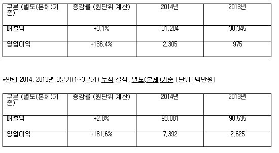 *안랩 2014, 2013년 3분기 당기 실적, 별도(본체)기준 [단위: 백만원]