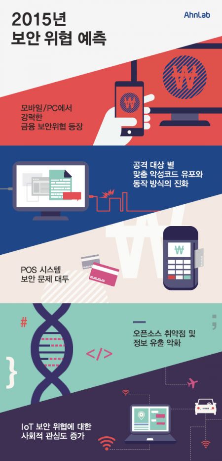 2014년 미국에서 발생한 대형 유통업체의 ‘POS 시스템(Point Of Sale System, 판매시점 정보관리시스템)’ 해킹이 발생해 천문학적인 숫자의 개인 금융정보가 유출된 사례가 있었다. 금융결제원의 '국내외 지급결제통계 분석(2003년~2012년까지)' 보고서에 따르면, POS단말기를 사용하는 신용/직불카드 사용건수가 2003년 18억8,000만건에서 2012년 98억4,000만건으로 늘었고, 인구 100만명 당 POS단말기 설치대수도 한국이 4만4,280대로 가장 많았다. 이에 따라 올해에는 국내에도 기존 POS단말기 공격뿐만 아니라, 포스 시스템 제작업체 대상 해킹 시도 등의 보다 다양하고 강력한 방식의 POS 시스템 공격 방식이 등장 할 것으로 예상된다.