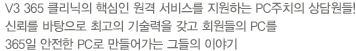 “V3 365 클리닉에서 원격 서비스를 제공하고 있는 상담원은 안철수연구소 제품 및 보안 문제 뿐 아니라 윈도 시스템 오류 해결 및 어플리케이션 사용에 높은 기술력을 가지고 있습니다. 또한 대부분 이전에 HP나 Dell PC 엔지니어 경력을 갖고 있어 하드웨어 관련 전문성도 높지요.”