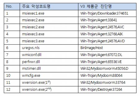 이번 공격에 이용된 악성코드는 마이둠 변종(Mydoom.88064, Mydoom.33764, Mydoom.45056.D)과, 또 다른 악성코드를 내려 받는 다운로더(Downloader.374651), 공격 대상 웹사이트 목록을 담은 파일(BinImage/Host), 네트워크 트래픽을 유발하는 다수의 에이전트(Agent.67072.DL, Agent.65536.VE) 등이 있다.