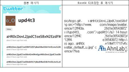 또한, 8월에는 국내에서도 사용자가 늘고 있는 트위터 서비스의 트윗(Tweet) 메시지를 Base64 인코딩하여 명령을 송/수신하는 악성코드도 발견되었다. 해당 메시지들은 다수의 URL로 해당 링크를 통해 다운로드되며 이렇게 다운로드된 악성코드는 금융관련 정보를 훔치는 역할을 했다.