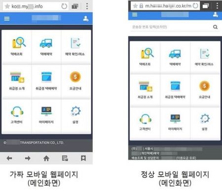 사용자가 무심코 스미싱 문자 내 URL을 클릭하면 실존하는 유명 택배사 홈페이지를 사칭한(보충자료1 참조) 가짜 페이지에 접속한다. 해당 가짜 페이지는 하단의 기업 설명 일부와 URL를 제외하고는 사용자가 구분이 어려울 정도로 실제 페이지와 다름없이 정교하게 제작됐다.