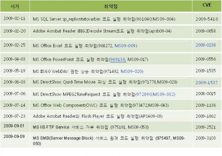 또한, 4월에 보고된 MS09-017 MS Office PowerPoint 코드 실행 취약점(KB969136)은 5월 정기패치(MS09-017)가 발표되기 전에 이미 해당 취약점을 이용한 악성코드가 배포되었고, 6월에는 “에어프랑스 447편 추락” 사건을 이용한 전자메일 전파로 더 큰 이슈가 되기도 하였다.