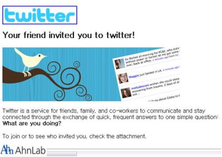 6월 17일 해외에서 발견되었던 소셜 네트워크 서비스(SNS, Social Network Service)로 유명한 트위터(Twitter)의 초대 메일로 위장한 악성코드가 9월 28일 오전 국내에서 다시 발견되었다.